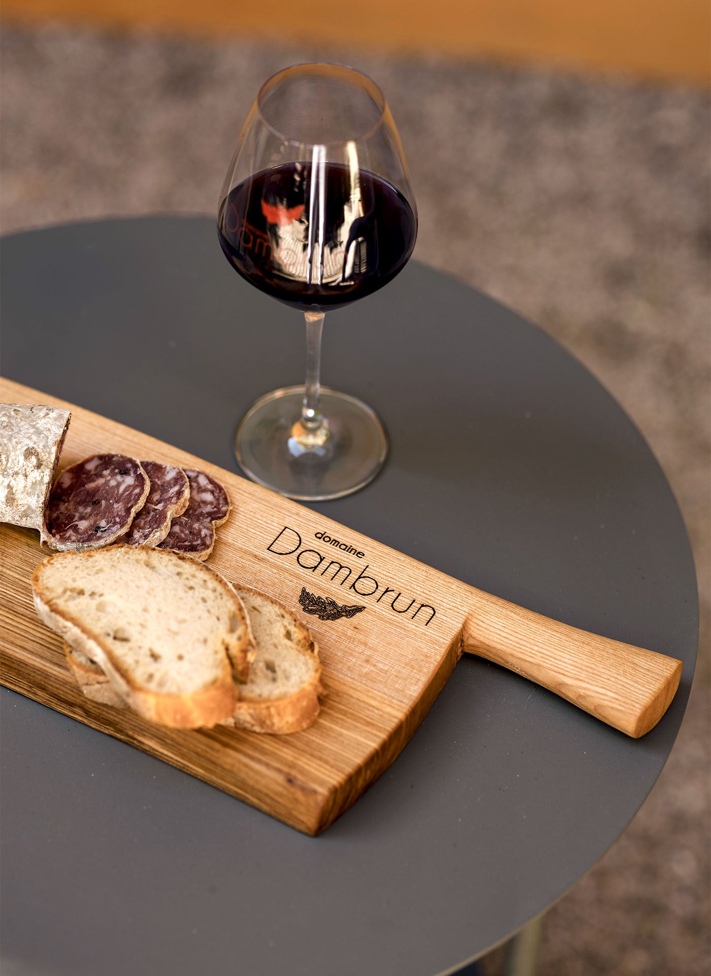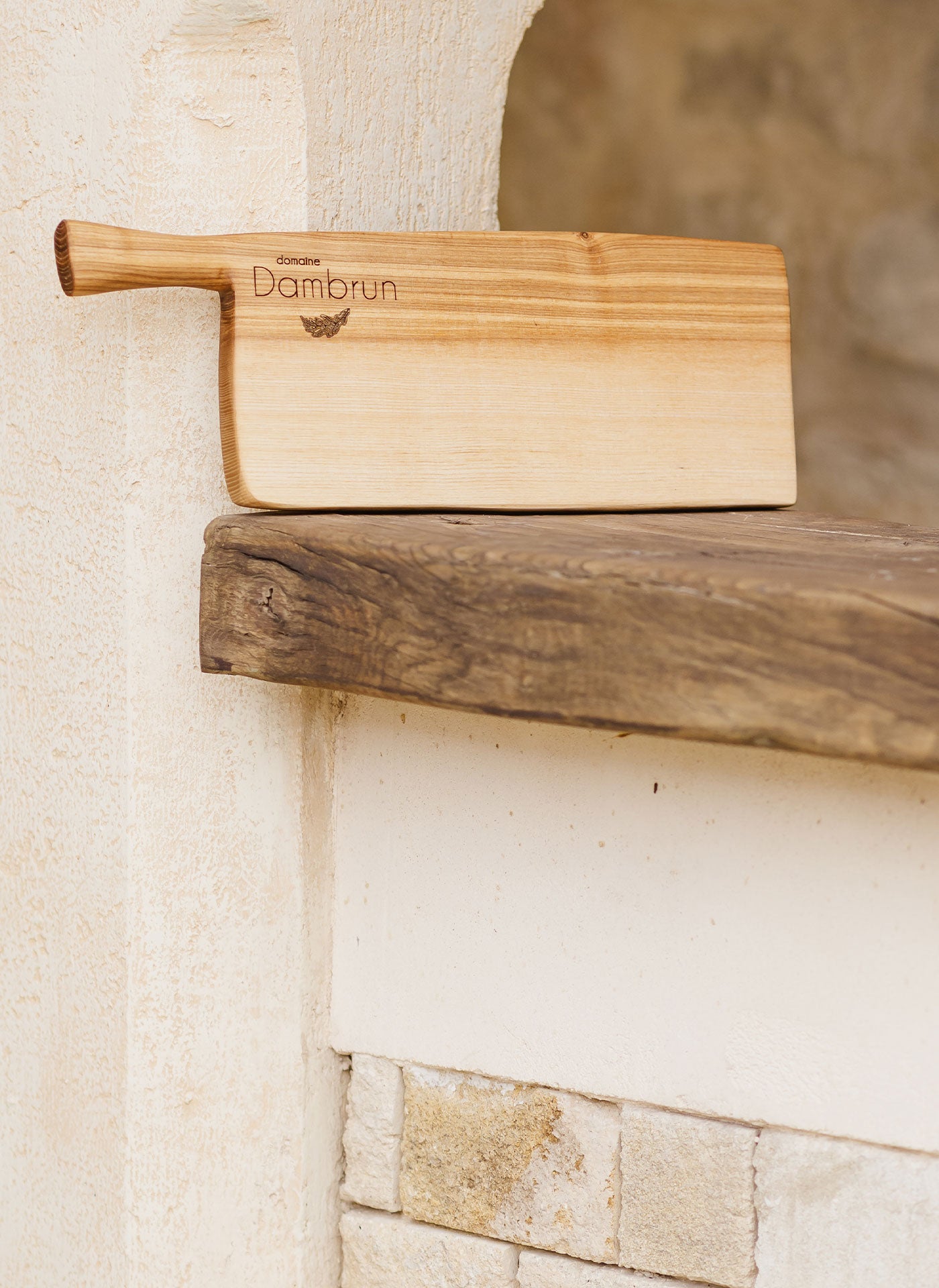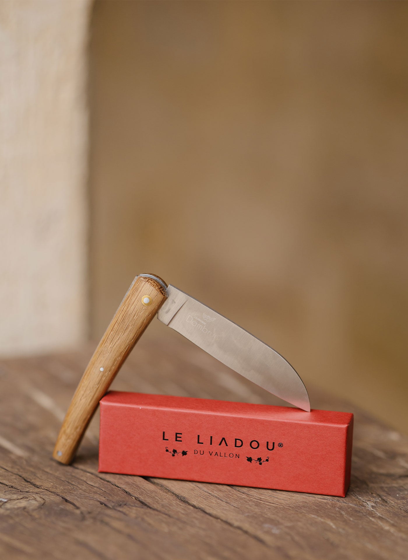 A handcrafted knife featuring a handle made from Domaine Dambrun oak barrels. Lifetime guarantee, handcrafted in Aveyron by the renowned Le Liadou du Vallon.